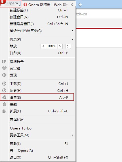 第二步:在Opera浏览器的左上方的“Opera”标志的地方,找到设置