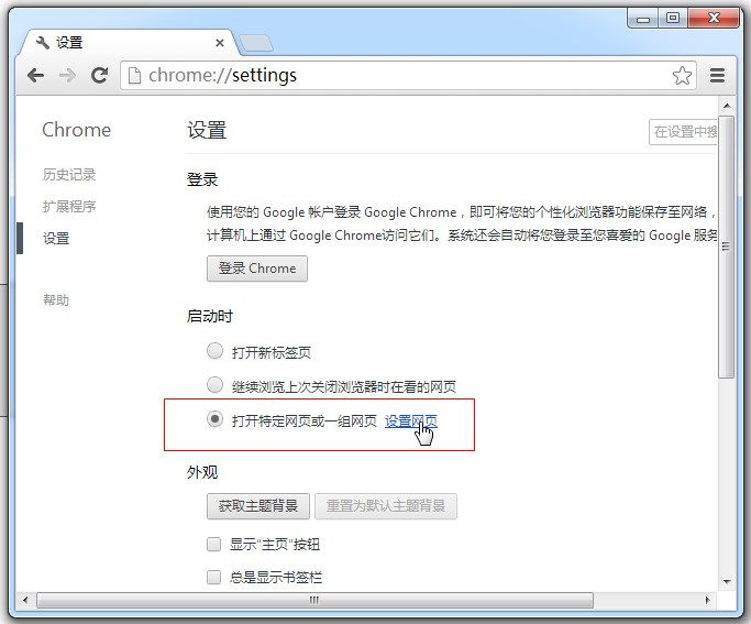2.进入“设置”界面,选择“启动时”-“打开特定网页或一组网页”-点击“设置网页”