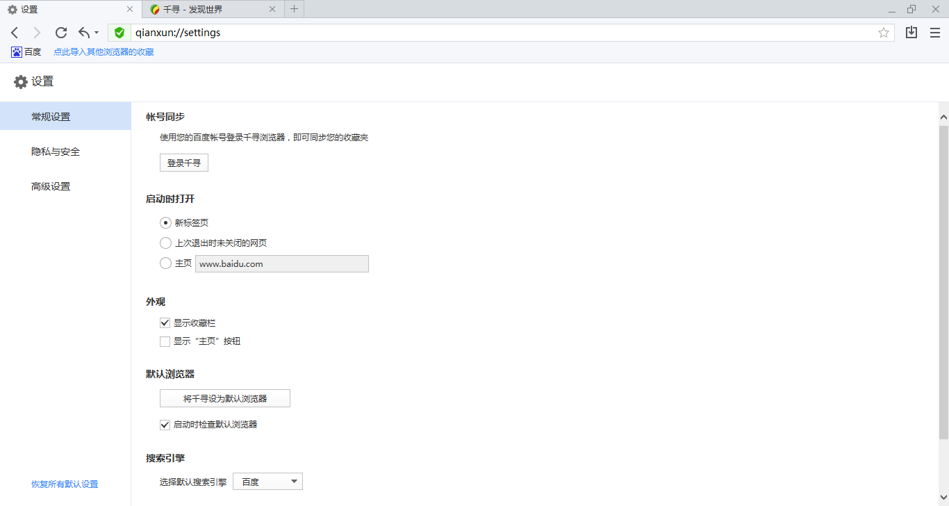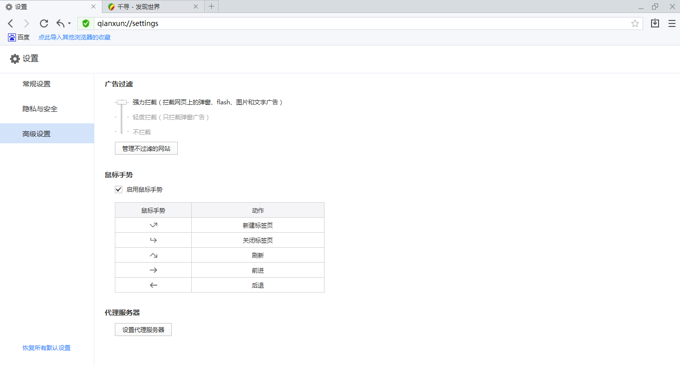 在千寻浏览器的设置页面中可以对浏览器的外观,主页等做调整,并没有什么特别的地方,天原在这就不做详细说明了。这里我们重点关注的是千寻浏览器中的广告过滤功能。