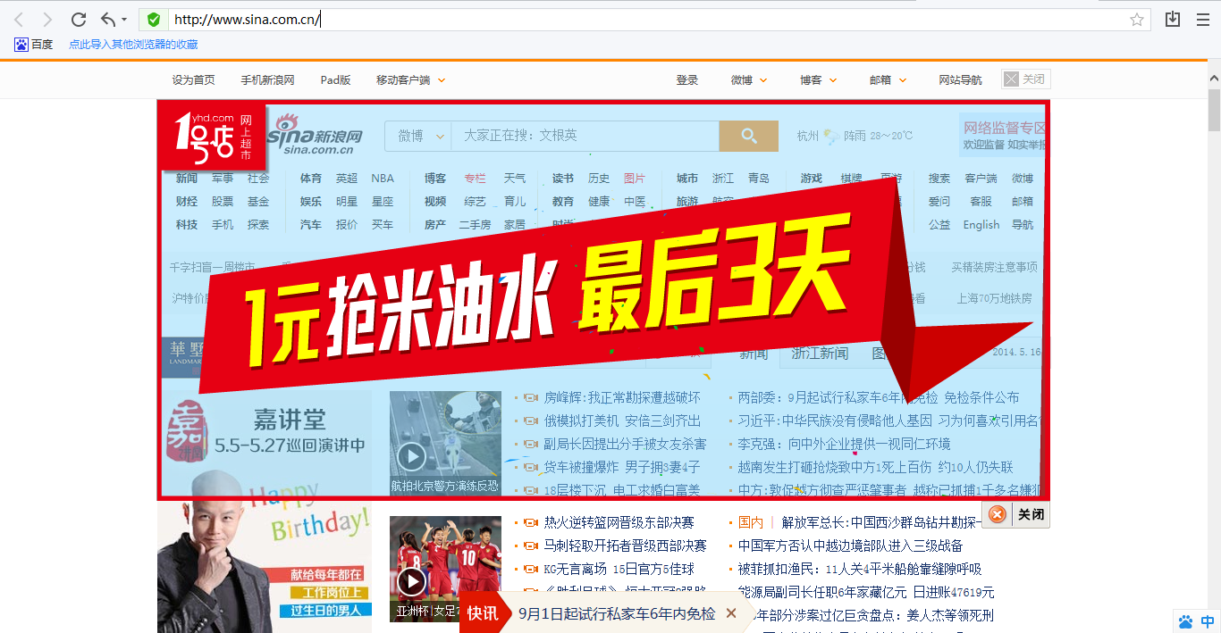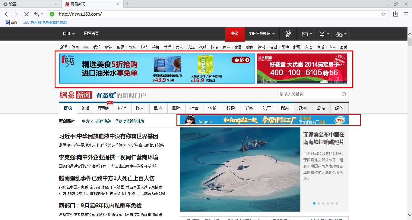 首先是没有开启反广告功能下的网易首页,除了常规广告外还有一个弹窗广告