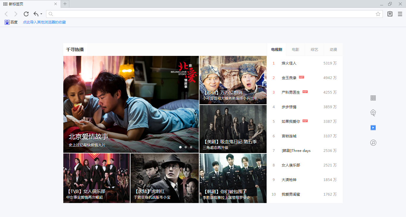 千寻浏览器的菜单栏设在页面的右侧,点击箭头所示即可弹出菜单栏,发现最近这类设定的浏览器真是越来越多了嘛,例如火狐
