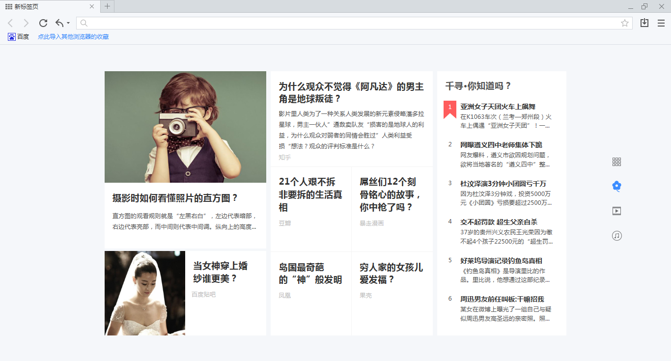 千寻浏览器的网址收藏夹支持从其他浏览器导入数据,换浏览器也不用担心收藏夹丢失啦,不过从使用中发现千寻浏览器的收藏夹导入功能支持的浏览器过少,我电脑上安装的火狐浏览器和百度浏览器就没有被检测出来,难道是只支持从IE导入?