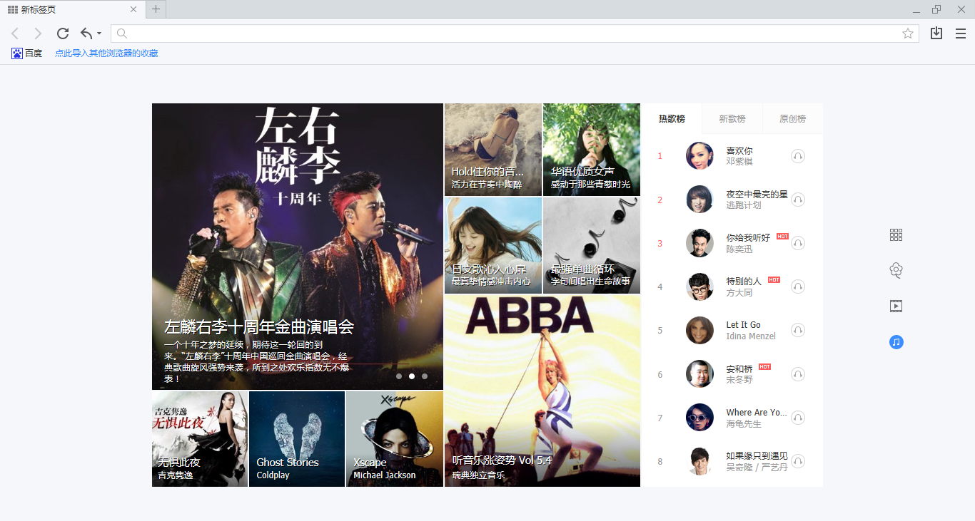 打开浏览器窗口,首先看到的是快速启动导航,默认预设了hao123,百度,淘宝,人人等页面入口,从购物到社交,相信不论是职业白领还是校园学生都能找到需要的内容。