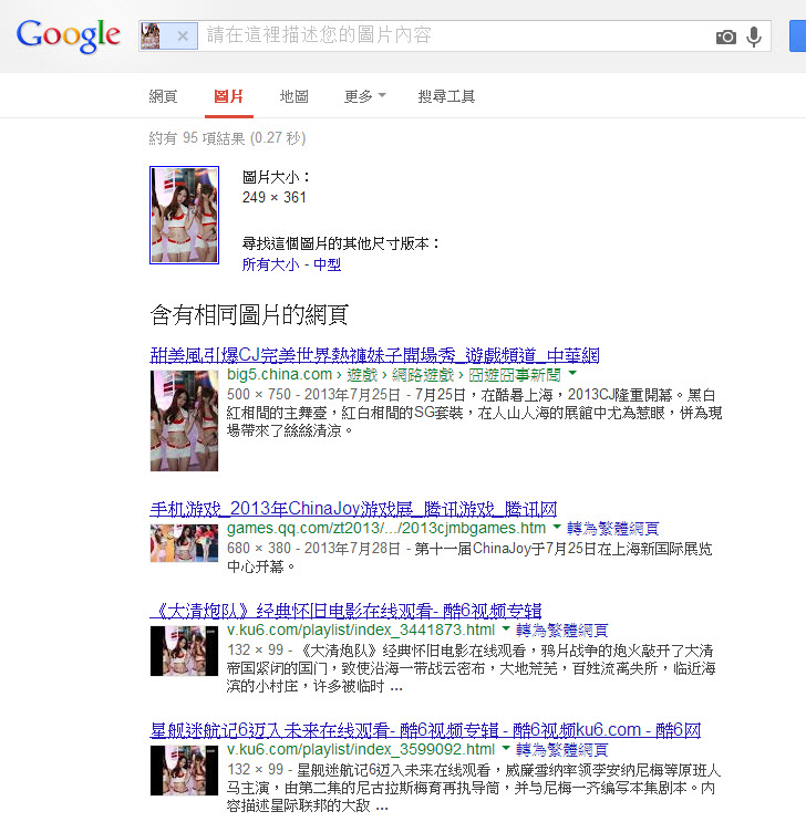 看看检索结果吧,是不是很精准?从搜索结果,我们马上就能找到很多相关的图片,甚至,可以了解到图片的出处,就这样,谷歌图片摇身一变成了“人肉搜索”的神器了。当然,实际上谷歌图片的以图搜图功能并不是只能找妹子那么简单,更多的应用就要看你自己的想象力了。