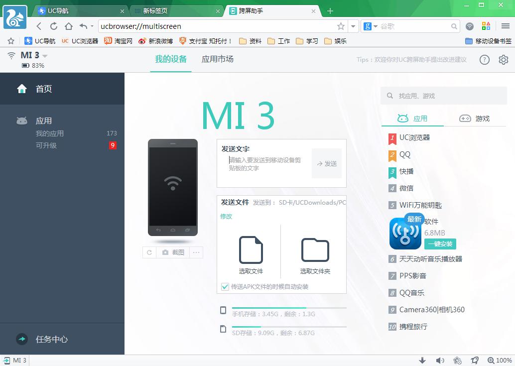 UC浏览器电脑版的一大亮点是可以直接和手机互动。使用云同步,不同设备间轻松同步标签、书签和个性设置,一个UC账号就能搞定;使用跨屏助手,连接手机和电脑等多设备,用户能够在电脑上管理手机,一键实现文字、文件互传,应用安装管理等操作。为了让手机等移动设备更好地和电脑互动,UC浏览器电脑版还自带免费Wi-Fi功能,让电脑变成路由,让手机随时随地使用Wi-Fi。为了让用户上网更自由,UC浏览器电脑版的“红杏出园”功能可以突破限制,轻松访问企业/校园局域网屏蔽站点,让原本无法连接的网站都可以顺利访问,浏览更加畅快。