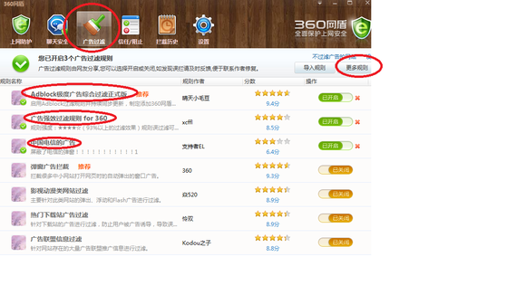 3.跳出360网盾,点更多规则,去下载图上三条规则的最新版,另外记得定期上网看看这三条规则有没有更新,有更新请尽量更新以保持最佳屏蔽效果(一定要配合360浏览器使用,我试过用搜狗,结果网盾基本没用)【其中最重要的是第二条规则一定要用,其他规则不开问题也不大,不过不要盲目的规则全开,会拖慢浏览器速度的】