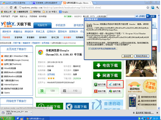 在搜索所需时如“谷歌浏览器”,进入下载页后选择迅雷会出现提示窗口,如图选择,以后就正常了。