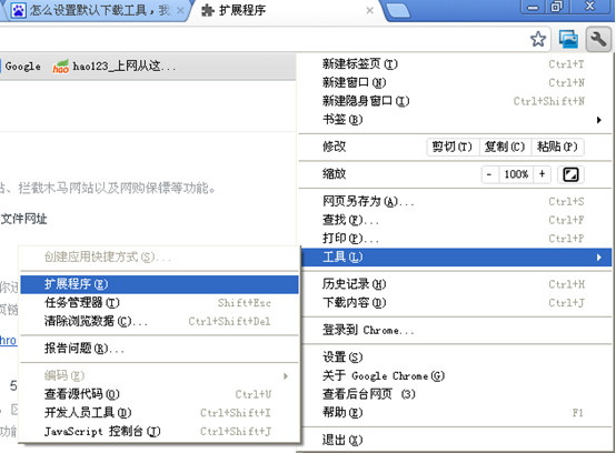 在出现的菜单中指向“工具”, 接着在点击扩展程序。