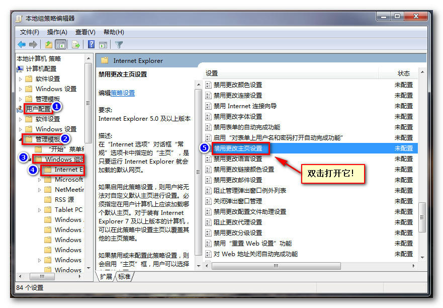 按回车键,然后弹出了【本地组策略编辑器】窗口,现在依次点击【用户配置---管理模板---Windows组件---Internet Explorer】,在上面的窗口右侧我们可以找到“禁用更改主页设置”这一项,双击打开,在设置标签中选中“已启用”,单击“确定”关闭“组策略”。这样就通过组策略锁定了IE主页了。