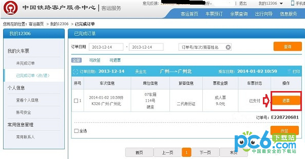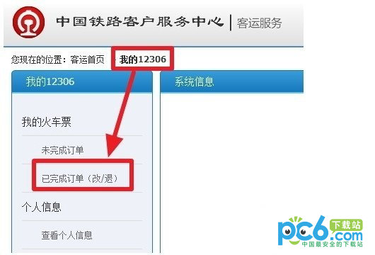 二、登录12306后,我们再点击进入“我的12306中心”然后点击“已完成订单”,如下图所示: