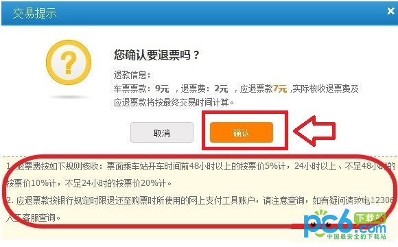 四、点击退票后,接下来会弹出一个确认退票对话框,里边会提示您需要扣除相关的退票费,如果没什么疑问,点击确定即可,如下图所示: