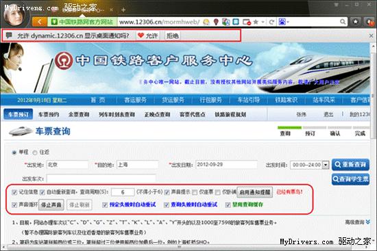 一旦抢票成功,该助手还能够第一时间通过多种方式提醒网民。除了当前页面提示“已经有票鸟”,它还有声音提醒。用户也可设置“允许dynamic.12306.cn显示桌面通知”,如下图。即使你在工作或者做其他事情,它也会及时提醒用户“可以订票了!”