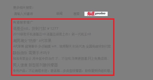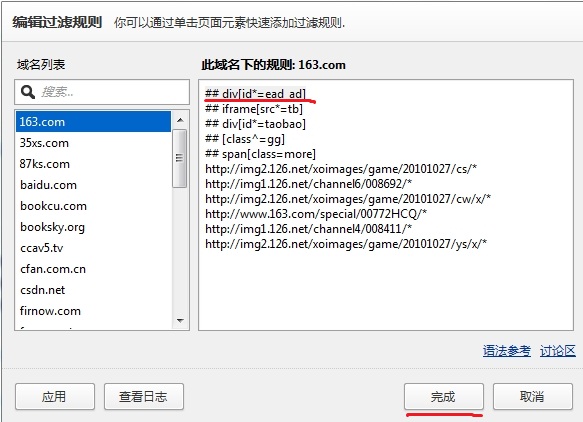 红线所示即为整个推广区广告的代码,因此要过滤它,只要浏览器右下角广告猎手中的编辑拦截规则,在其中输入## div[id*=ead_ad],点击完成,即可过滤这部分广告。