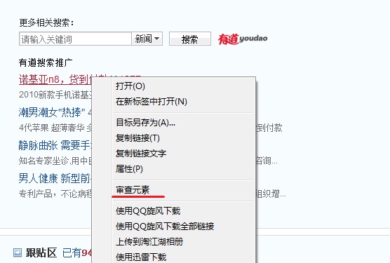 上图方框内文字广告,手动过滤广告时是灰色,无法简单点击过滤,这时要用到元素过滤,在广告上右键选择“审查元素”