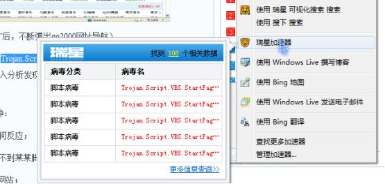4、病毒名查询,在看网页的时候,如果看到一些不知道是什么的病毒,通过瑞星加速器可以直接查到该病毒的具体信息。选中网页中的病毒名称,点击旁边出现的