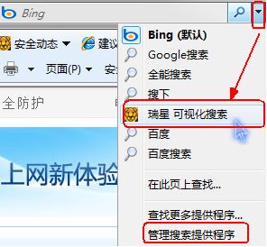 3、可疑进程查询,利用的是瑞星可视化搜索这个功能,在浏览器右上角的搜索位置,点击右侧小三角,然后选中瑞星狮子这项,在搜索框中,输入进程名称后即可进行搜索。如果想把这个功能作为默认搜索,点下方的管理搜索提供程序,将瑞星搜索设置成默认。