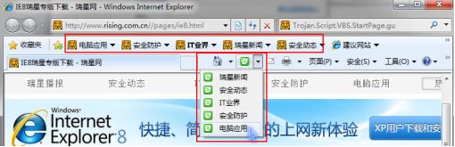 最近看到瑞星和微软联合发布了“瑞星专版IE8”浏览器,开始还不太理解,以为瑞星开始要进军浏览器了呢,后来研究了一下,发现是在IE8的基础上,增加了一些实用插件,从而提高IE和电脑的安全。 瑞星IE8(“瑞星专版IE8浏览器”字太多了)功能篇: 快速订阅瑞星安全信息,如果你是一个安全达人,对最近的木马病毒、0day漏洞、网络犯罪信息非常关注的话,订阅后,可以实时得到来自瑞星的权威提示; 瑞星可视化搜索,原版的IE8在界面右上角集成了一个搜索功能,默认是baidu,瑞星IE8与原版搜索基本一致,但是针对木马病毒的,也就是说当你发现不明进程时,直接在瑞星搜索那里输入进程名称,随后就可以查到这个进程的详细信息了,到底是不是病毒、进程出处、厂商信息等等都可以马上看到。 病毒即时查询,在上网的时候,如果看到最新病毒,想了解具体信息时,通过瑞星IE8的“瑞星加速器”就可以直接搜索到了。 下面介绍一些瑞星IE8的安装和使用方法: 安装篇: 没有安装ie8的同志直接下载瑞星IE8安装包进行安装, 地址:http://rsdownload.rising.com.cn/for_down/kakasoft/IE8-Setup-Full.exe (xp系统) http://rsdownload.rising.com.cn/for_down/kakasoft/IE8-Setup-vista.exe (vista系统)