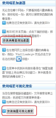 2、已经安装了原版ie8的同志,用ie打开http://www.rising.com.cn//pages/ie8.html,这个网址,分别点击右侧的“安装病毒查询加速器”和“安装瑞星可视化搜索”