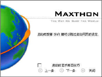 由于MyIE2技巧和功能实在太多,一些网友往往使用了很久之后,都不知道MyIE2还有“这样”“那样”的功能。针对这个情况,Maxthon 1.0特地加入了每日技巧这个功能。在用户每次启动Maxthon之后都可以通过这个功能,多了解一些Maxthon的奥妙功能。