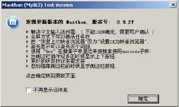 在较早的版本启动的时候Maxthon有一个小Bug。在程序启动之后,Maxthon会提示找到新版本。