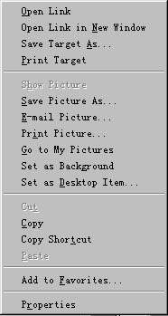 而且你在图片上点击鼠标右键试一下,看一下跳出的菜单(见插图2)是不是比原来的右键菜单多了几个命令(中间的一排)。除了已有的"另存为","设为墙纸","设为桌面项"功能外,还提供了"打印","用电子邮件发送","用指定图象编辑工具直接打开"的选项。