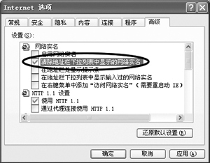 答:地址栏中输入中文进行浏览,其实是使用了网络实名的模糊查找功能,所以你只要在控制面板的“添加/删除程序”中将“网络实名”删除,那么那些地址栏中的内容也将随着删除。另外如果你想在不删除“网络实名”的基础上删除中文网址,可以选择“工具→Internet选项→高级”,最上面有一个“清除地址栏下拉列表中显示的网络实名”,选择它,确定后即可(如图1)。