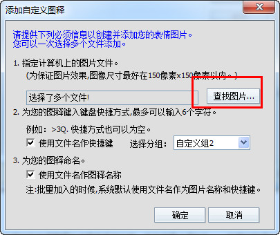 3、点击“查找图片”,找到图片路径,这里可以选择多个图片——点击打开——还可以为你的图片键入键盘快捷方式,为你的图释命名等——完成这些之后点击确定即可。