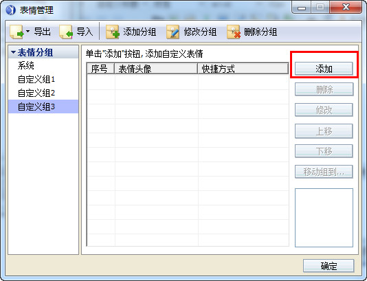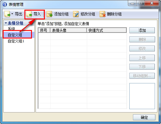 3、在弹出的表情管理中选择添加分组(系统表情分组是不支持导入表情的,必须添加分组)--添加好分组之后
