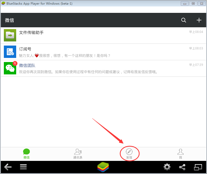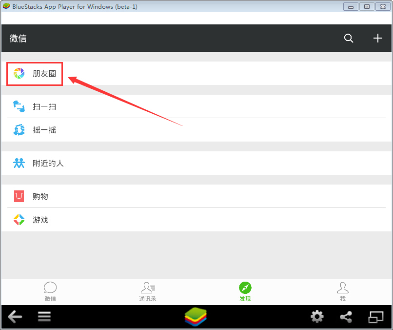 2.微信电脑版登录后,点发现(操作方法与在手机上一样),选择朋友圈