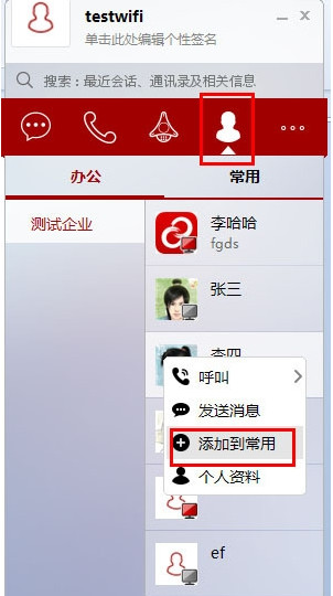 第一、登录第一企信后,选择“信息”图标,选择你要添加的人,然后单间鼠标右键,就可以看到“添加到常用”,选择这个按钮即可