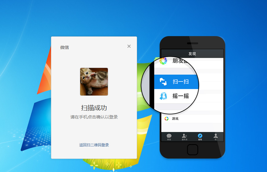 1、首先要下载微信,安装后我们可以看到桌面出现一个“微信二维码”,只要我们将鼠标移到二位码处就可以看到它提示我们用手机扫一扫,大家就可以掏出你的手机用“扫一扫”扫我们桌面的二维码