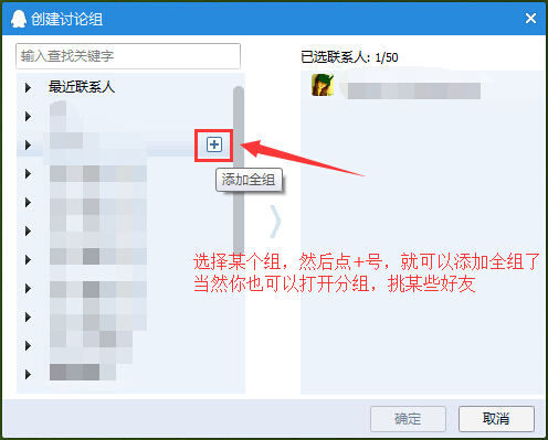 2.在弹出的创建讨论组对话框左侧好友列表里选择好友,也可以直接将某个组的全部好友添加进去。讨论组最多只能选择50人。