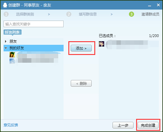 4.在好友列表中选择添加好友,即你需要群发信息的对象。最后选择完成创建即可。