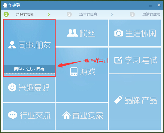 2.在弹出的创建群对话框中选择群类别(本文以同事.朋友为示范)