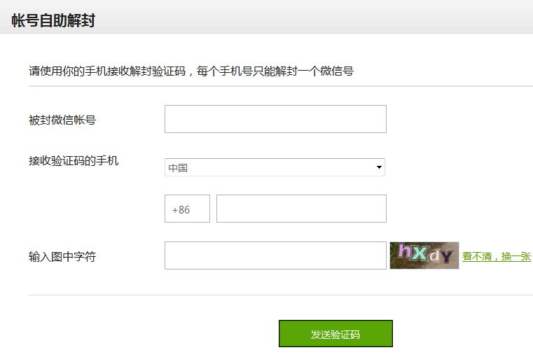 步骤二:点击:自助解除登录或功能限制“输入被封微信帐号(可以是QQ号、邮箱、微信号或手机号),输入接收验证码的手机,每个手机号只能解封一个微信号。输入图片中显示的字符,然后点击“发送验证码”按钮即可。
