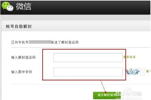步骤四:下一页面中会提示您:“已向手机号×××发送了解封验证码。”在手机中找到发送的验证码,然后输入到如图所示的文本框中,并填写图片中的字符,最后点击“提交解封请求”按钮。