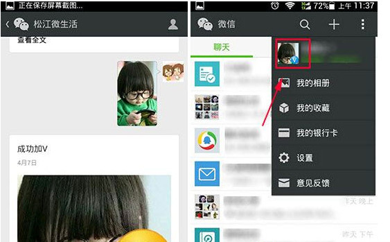3)在“松江微生活”中,发送你需要加V的图片,不需要多久,就会发现“成功加V”的回复,下载加V的图片,然后更换掉你的微信头像,就可以发现微信头像已经成功加V了。