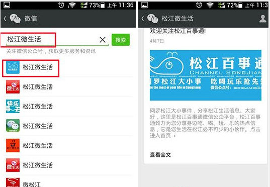 2)在“订阅号”中添加“松江微生活”这个公众号,然后点击进入“松江微生活”这个页面。