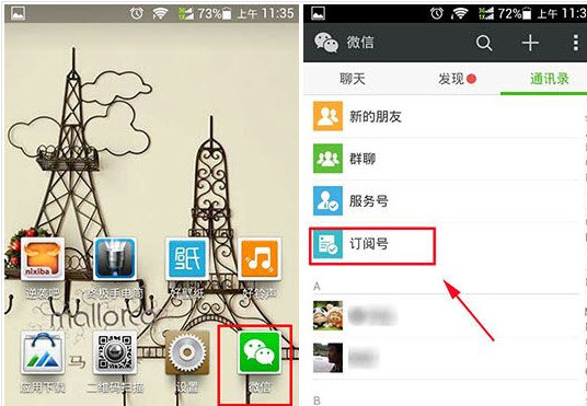 1)首先打开“微信”,然后在“微信”的通讯录中点击进入“订阅号”。