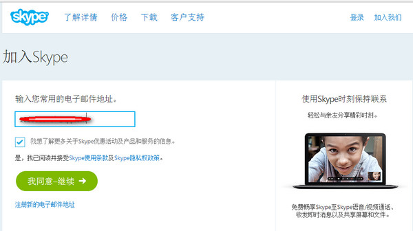 步骤四:同意加入skype即可注册成功,邮件通知可以选择取消