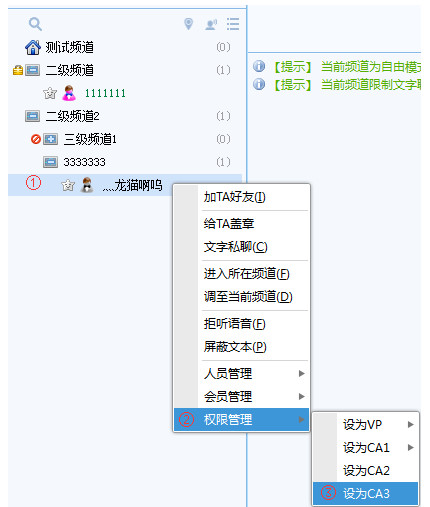 添加三级管理需要在三级频道右键点击用户马甲--权限管理--设为CA3