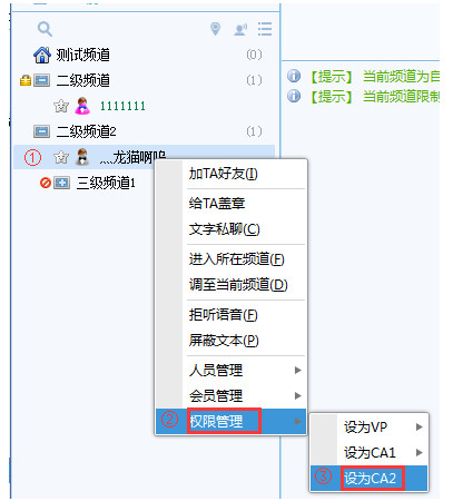 添加二级管理需要在二级频道右键点击用户马甲--权限管理--设为CA2