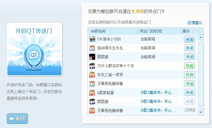 第二步:点击,可以看到您拥有的QQ群列表。点击开启,可以为该群提供一个当前房间的入口(QT传送门);点击关闭,可以关闭该入口。