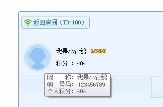 进入房间后,鼠标悬停在成员列表中用户的个人信息栏,显示用户的个人资料中可查看个人积分。