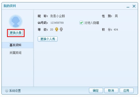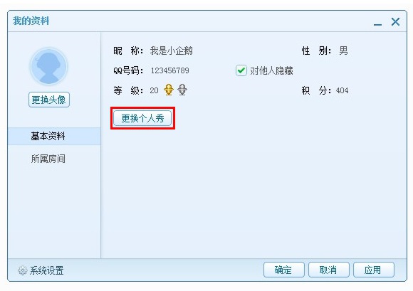 点击主面板右上角菜单中的个人设置里可更换个人秀,换上喜爱的照片,无论在自己房间,或其他房间都可展现。