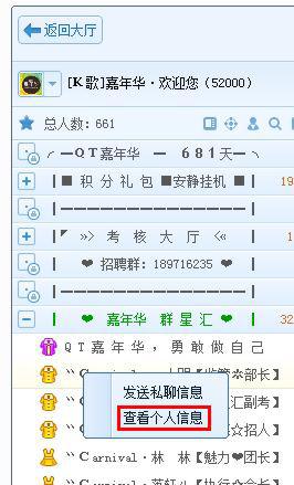 进入房间后,右键单击成员列表的用户,选择查看个人信息。
