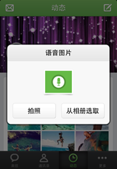 长按发布按钮,就会出现“语音图片”,可以拍照或从相册中选取图片后录音,把所见所闻分享给好友。也可以从你的手机相册里选取图片。录音最长可录制120秒。