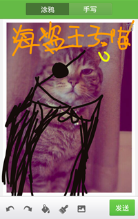 涂鸦可不仅仅是在白板上画画,还可以直接在照片上涂抹创作。在涂鸦页面点击下方的图标就可以了,可以选择现拍一张照片,或者在相册里选一张。
