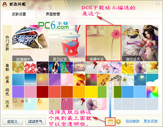 2.选择自已喜欢的皮肤,然后点窗口右下方倒数第四个按钮,将滚动条拖动到最上方就将皮肤全透明啦。(如果想使用自已从网上下载的皮肤的话就可以点自定义,后面的步骤一样)。