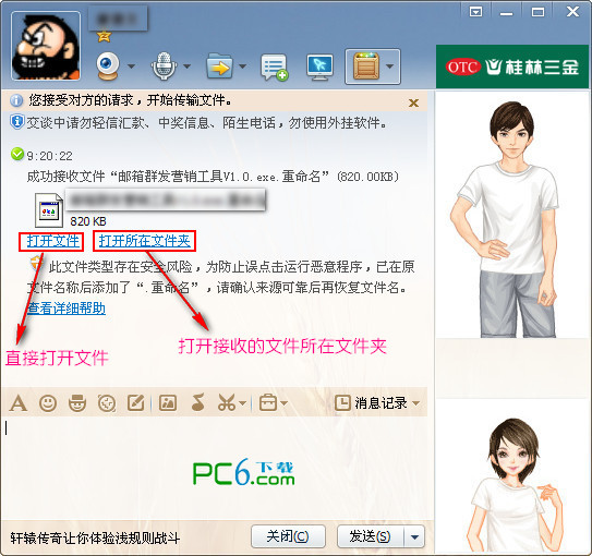 如果是对方发离线文件给你,你直接点接受,那么接受完之后很我童鞋就不知道文件存在哪了吧,没关系,你可以直接点开打所在文件夹,或者是打开文件即可。如果你已经关闭了聊天框,打开聊天记录一样可以。通常如果没有另存为的话一文件一般在qq安装目录下FileRecv文件夹下(即QQ\Users\你的qq号码\FileRecv)